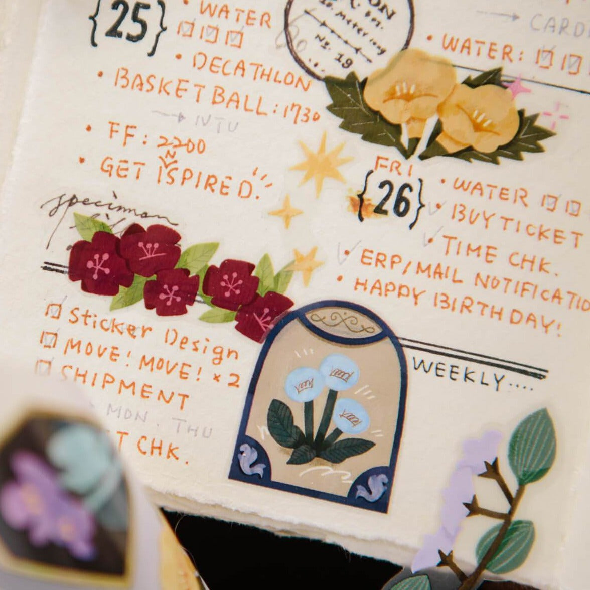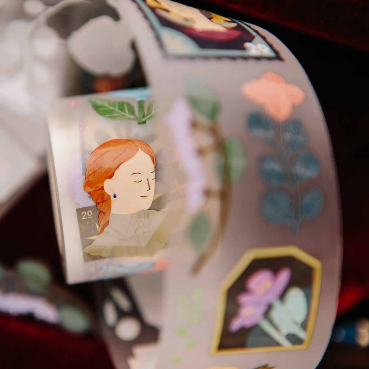 Each stamp holds its own story, with beautiful flowers growing around it.