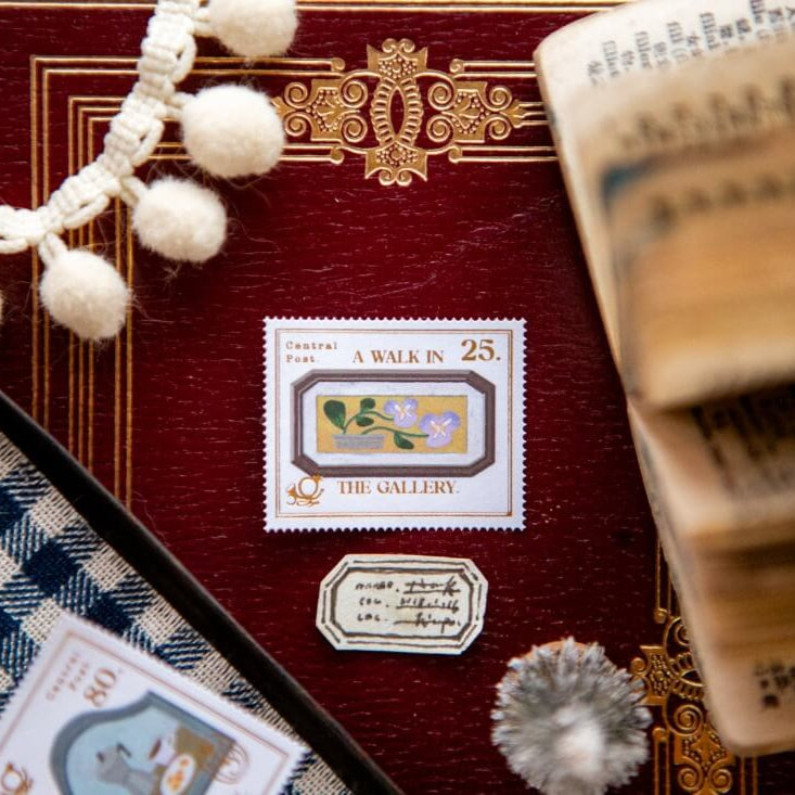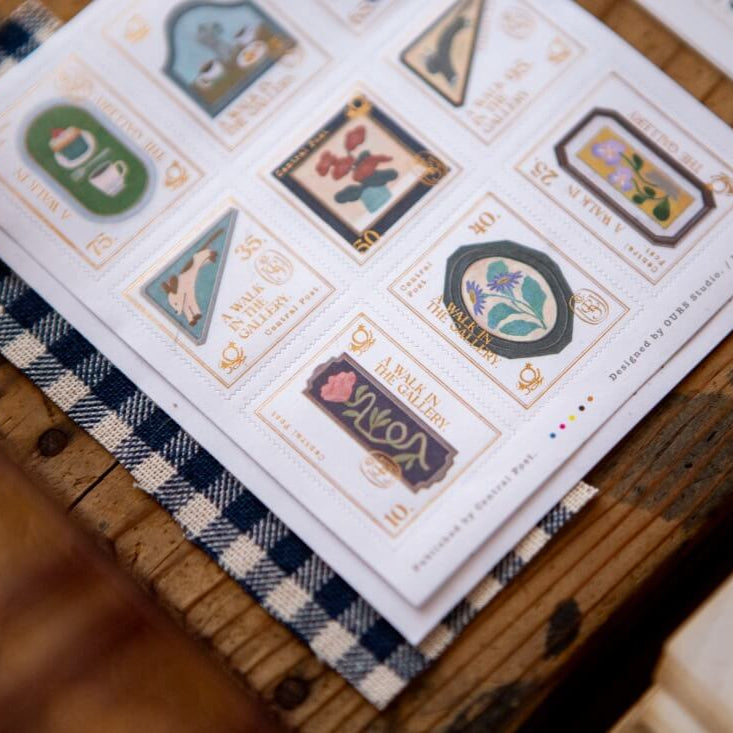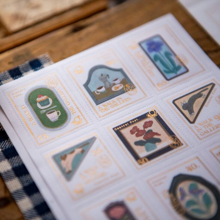 Discover the captivating tales held within each window. These postage-stamp-inspired sticker sheet showcases intricate illustrations by , adorned with elegant gold foil accents.