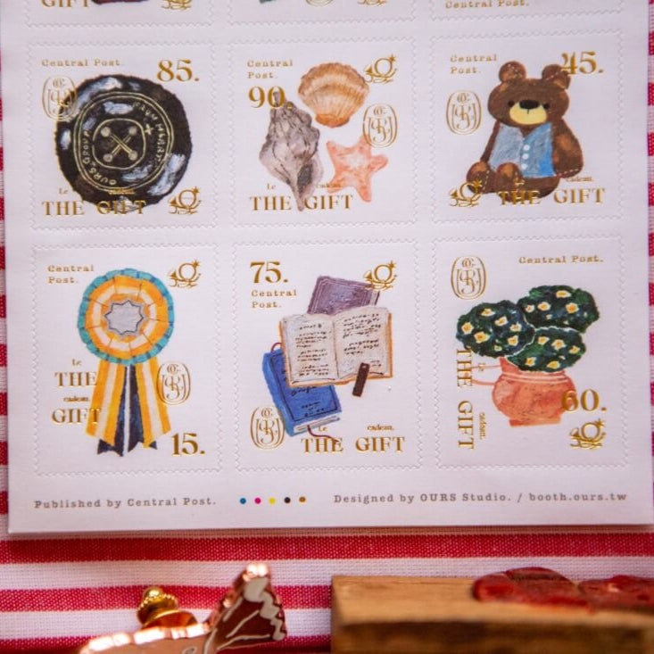 Discover the captivating tales held within each window. These postage-stamp-inspired sticker sheet showcases intricate illustrations by , adorned with elegant gold foil accents.